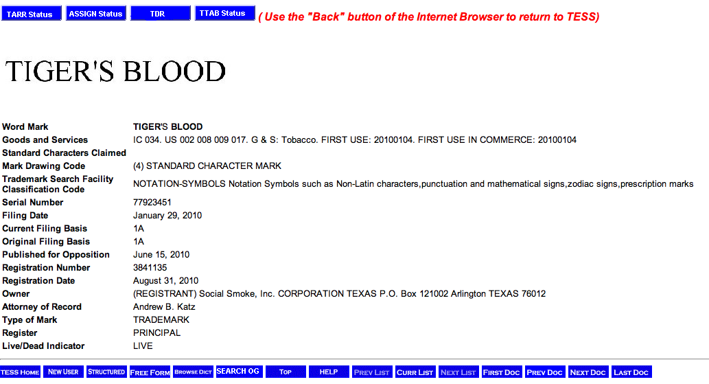 Here’s a review of the brief yet spectacular trademark history of TIGER BLOOD: