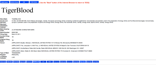 TIGER’S BLOOD – Registered: August 31, 2010 Date of First Use: January 4, 2010
