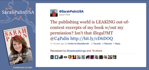 Presumably, it’s the nature of the “leak” prior to the book being on sale that has bothered Palin. But that’s also a common practice and most publishers consider it welcome free advertising leading into a big book launch. The next hearing is November 30, a week after the book release, so this may be a moot point by that time.
