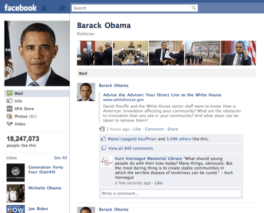 This upgrade goes a long way toward allowing businesses* to communicate independently of a particular individual’s identity. No longer restricted to their own Walls, Pages can go forth throughout Facebook and spread their unique message. Pages now allow organizations to more directly have a unified, branded voice in Facebook politics: