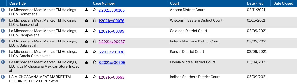 Seeking to claim undeniably broader protection over “LA MICHOACANA” in connection with grocery stores, the Plaintiff has brought numerous lawsuits over the last few years against small grocers using the term “Michoacana” (or some variation) in their name. Two new Indiana lawsuits are the 6th and 7th filed by La Michoacana against small grocers just this year.